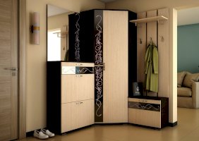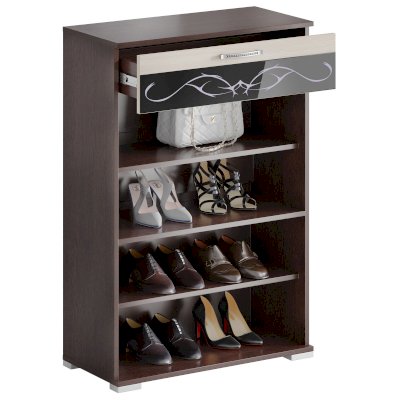 В тумбе 2 секции под обувь с полками, оборудованные газовыми кронштейнами и ящик на шариковых направляющих длиной 300 мм.